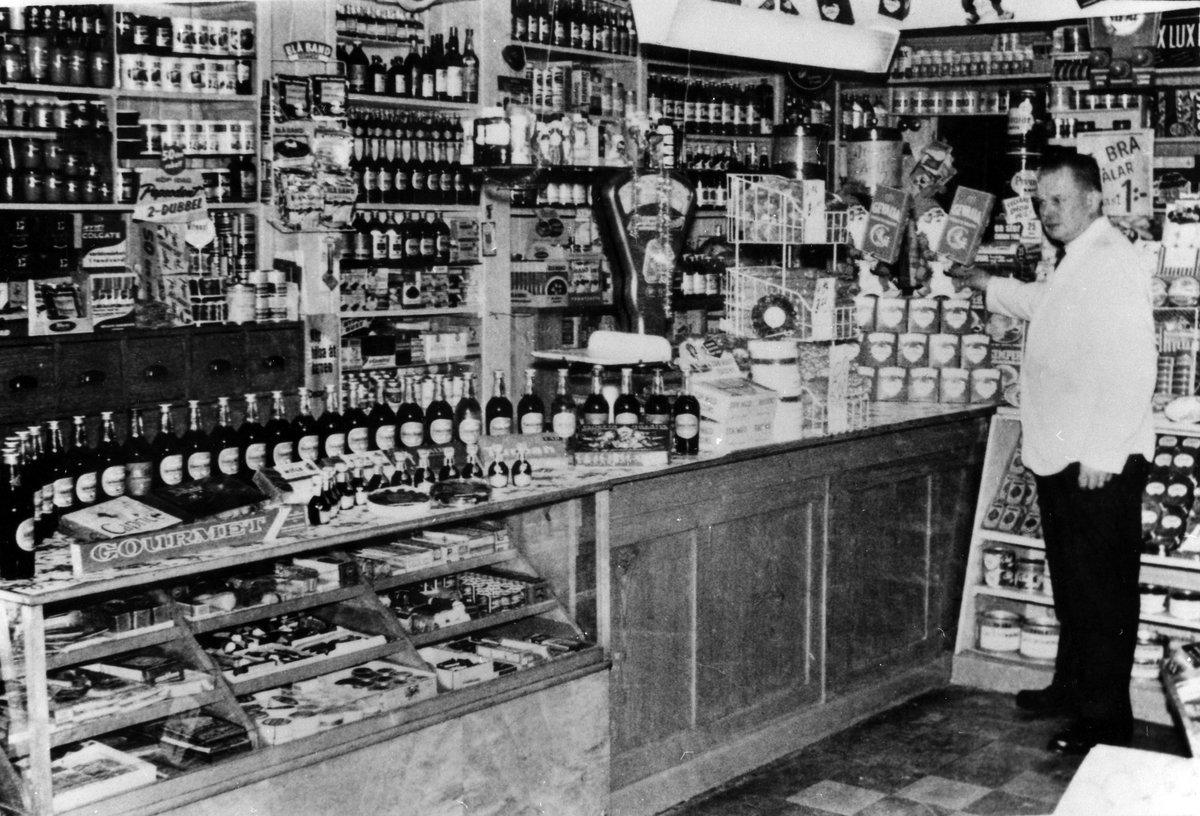 Inifrån Gunnar Johanssons speceriaffär. En man står framför disken i en vit skjorta. Väggarna och disken är fyllda med diverse varor.