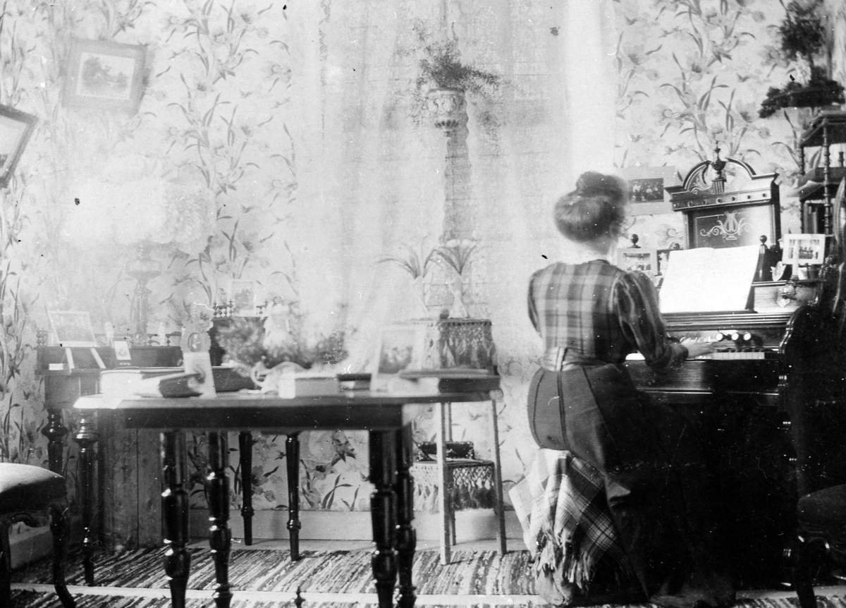Angsjöns skola. Hemsjö socken. Interiör från lärobostaden. Originalet på dagsljuspapper i vykortsformat.