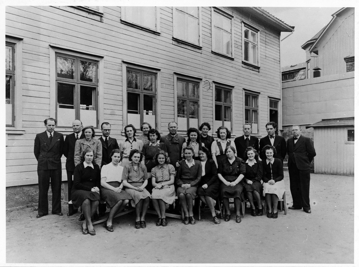 Gruppbild av 16 kvinnor och 7 män anställda vid konfektionsfabriken RIX på Norra Strömgatan.