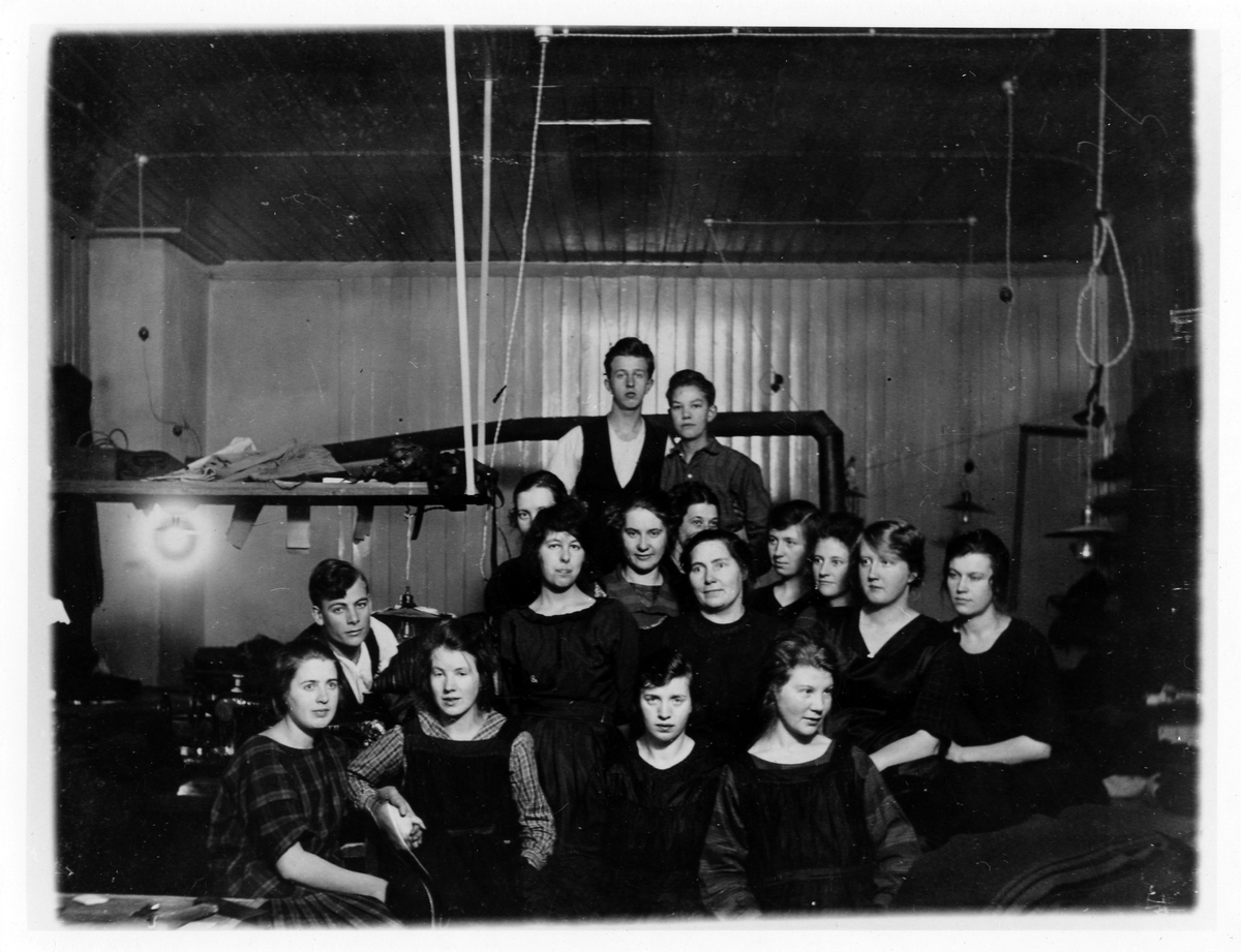 Gruppbild av 3 män och 13 kvinnor på Edvin Lindgrens skrädderi, Torggatan.