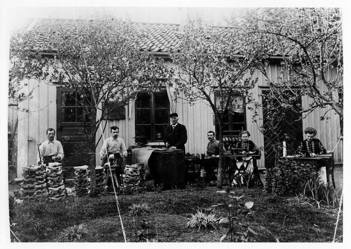 Johannes Bengtssons toffelmakeri, kv Storken, Norra Strömgatan. Från vänster: Elof Johansson, Nils Strandberg, Johannes Bengtsson, okänd, Amy Bengtsson och Rut Bengtsson sitter vid varsin symaskin. Bakom dom ett enplanshus i trä där ett barn tittar ut genom ett av fönstren. Kvinnorna är döttrar till Johannes.