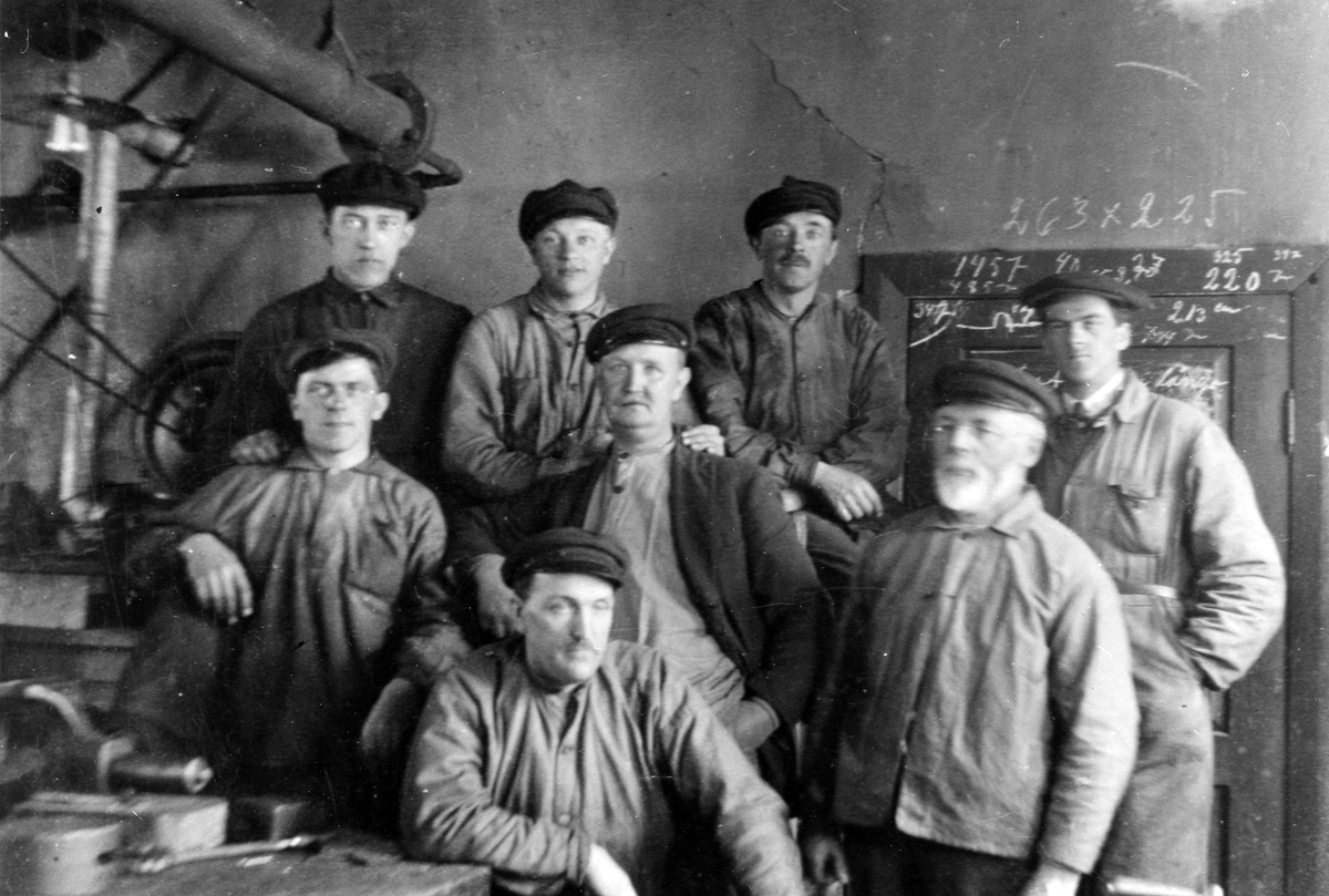 Alingsås bomullsväveri. Gruppbild med personal från Alingsås Bomullsväveris nya fabrik vid Gerdsken. Anteckning på bilden "A-ås Bomullsväveri, /Henning nr 2 fv."