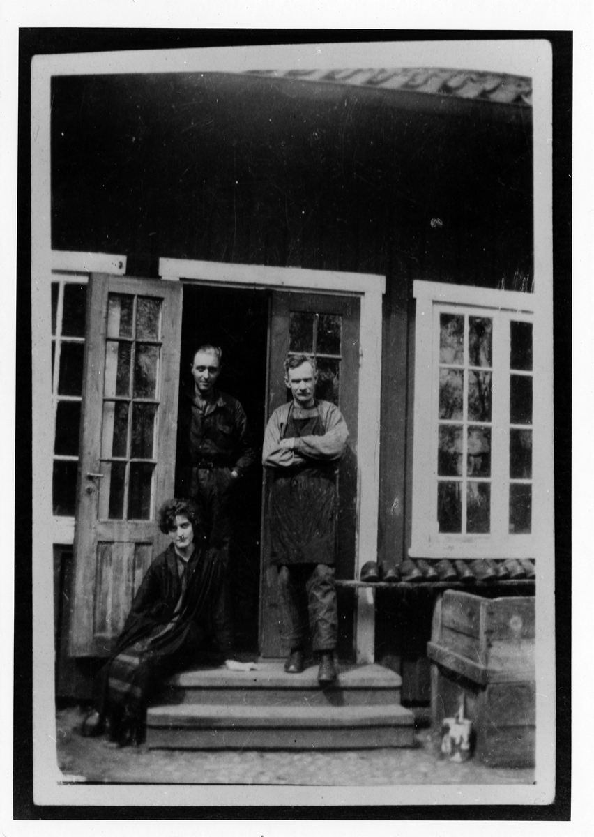 Tre personer vid dörröppningen till Färdigs toffelmakeri. Innehavare av Toffelmakeriet var Algot Färdig (med förklädet), han hade också Café Vilan i hörnhuset. Den andre mannen i dörren är en anställd och kvinnan heter Ester Färdig och är dotter till Algot.