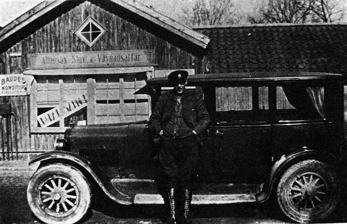 En man står med händerna i fickan och lutar sig mot en personbil. Bakom honom syns skyltar med text "Baudes Konditori" och "Alingsås Stuv & Vävnadsaffär"