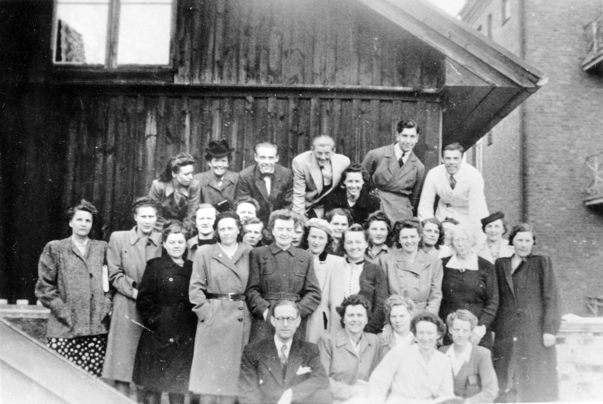 Gruppbild av 31 EPA-anställda, kvinnor och män, framför gaveln på ett trähus. Längst bak, 2:a från höger: Ivan Rudebo, lagerchef.