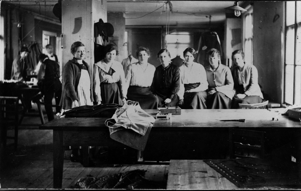 Personalgruppbild tagen i en av Oskar Molanders verkstäder. Innan KABOM fick stora lokaler låg syverkstäderna utspridda i olika lokaler runt om i staden. Denna låg på Göteborgsvägen nära järnvägsövergången.