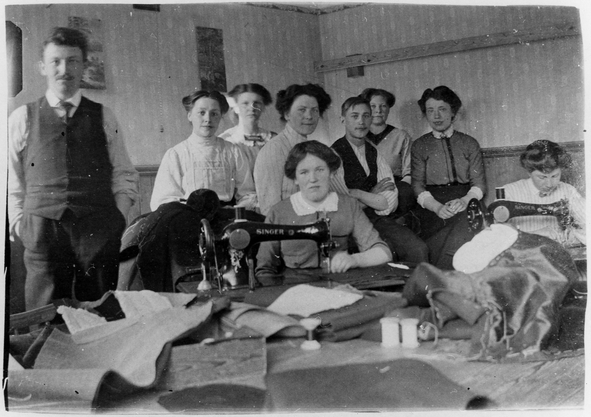 Gruppbild på personalen från Molanders syverkstad i Norinderska huset, kv Liljan 1. 2 män och 7 kvinnor varav 2 sitter vid en symaskin.