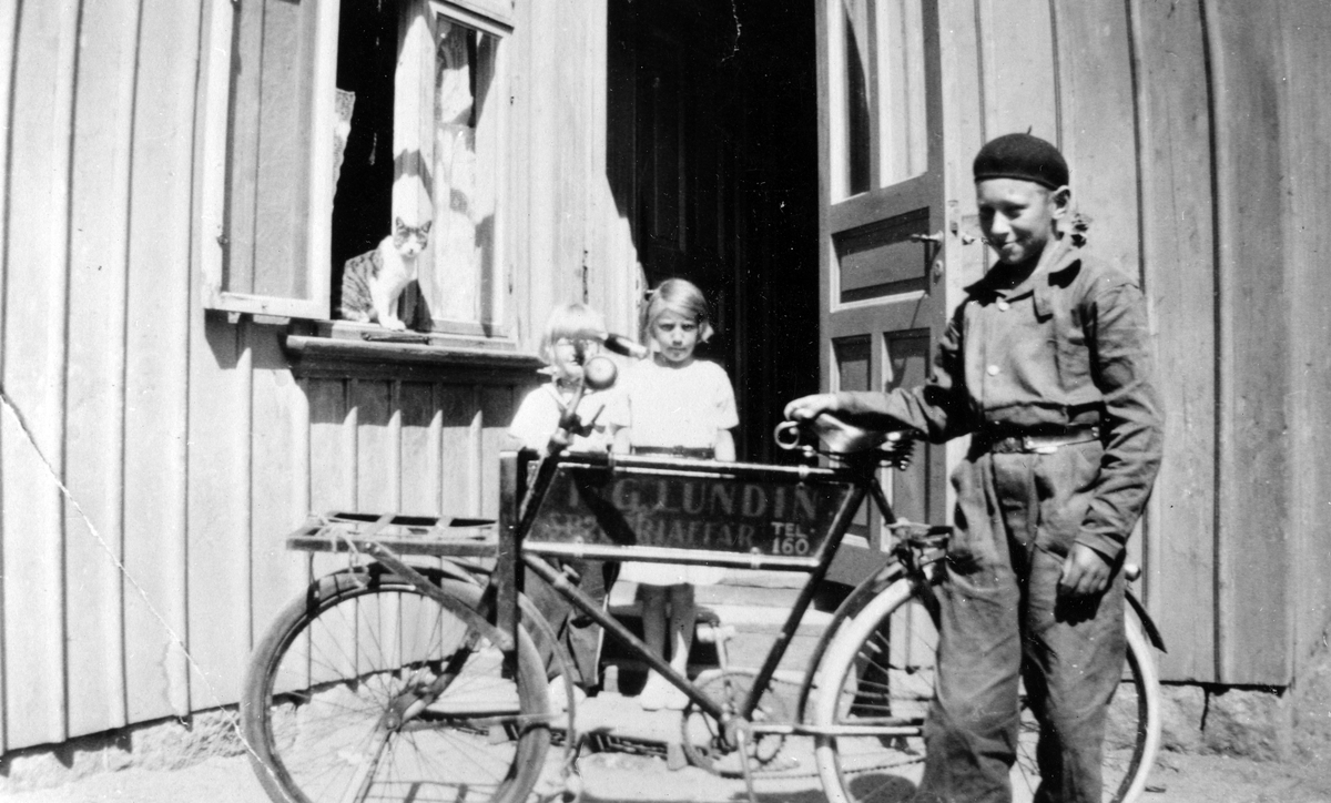 Cykeln har pakethållare över främre däck samt en verksamhetsskylt på ramen med texten "H G Lundin Speceriaffär. Tel 160". Bakom cykeln står två flickor och en katt sitter i ett fönster.