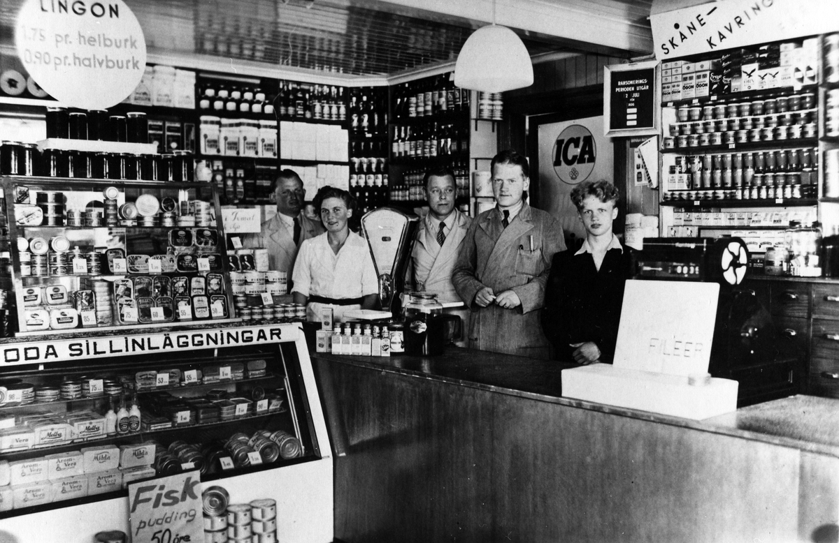 Inifrån Sandbergs speceriaffär. Bakom disken står 3 män, 1 kvinna och 1 tonårspojke. Till vänster en stor glasdisk fylld med olika sillinläggningar.