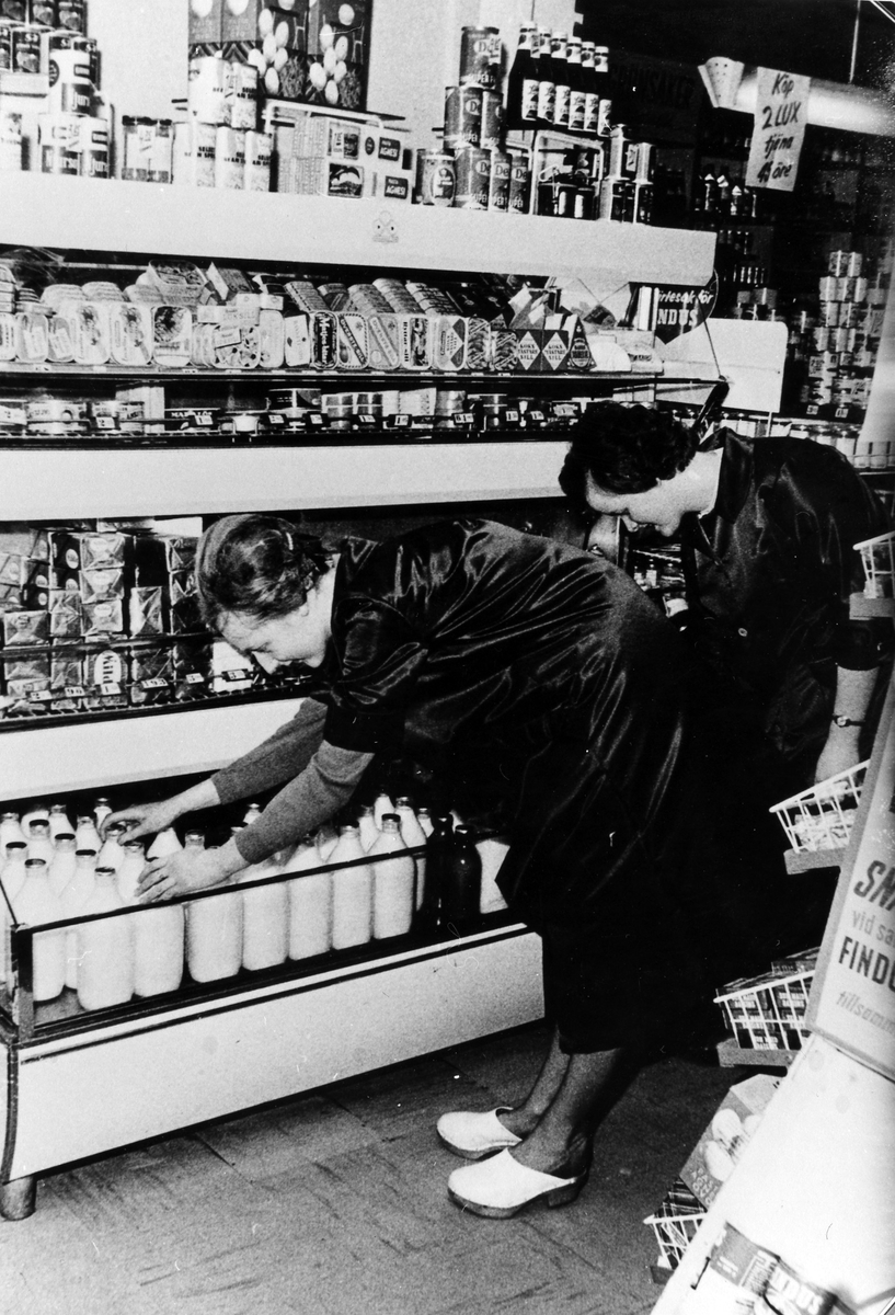 Inifrån Sandbergs speceriaffär. 2 kvinnor sorterar bland mjölkflaskorna.