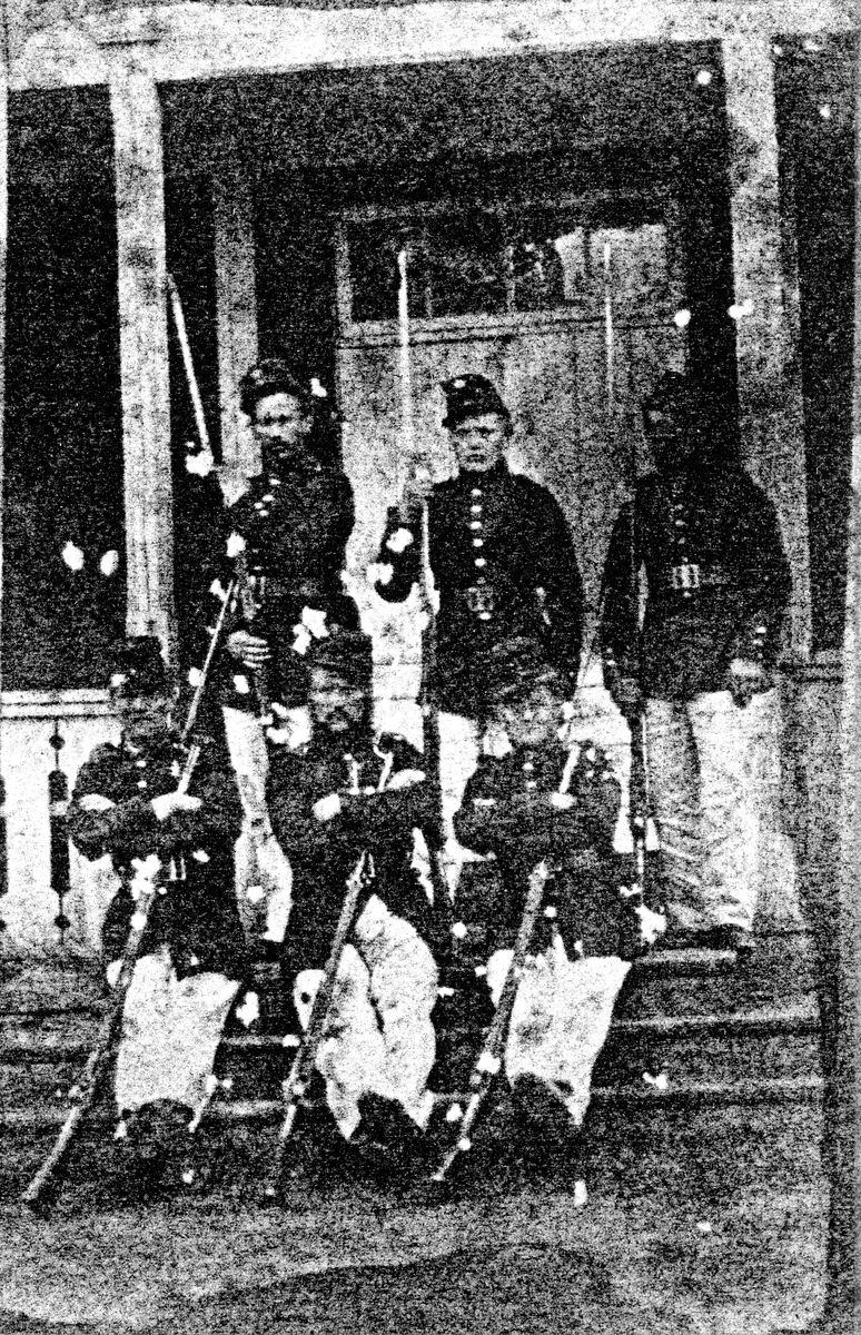 Gruppbild av sex män i uniform med gevär, tillhörande Alingsås Skarpskyttekår.