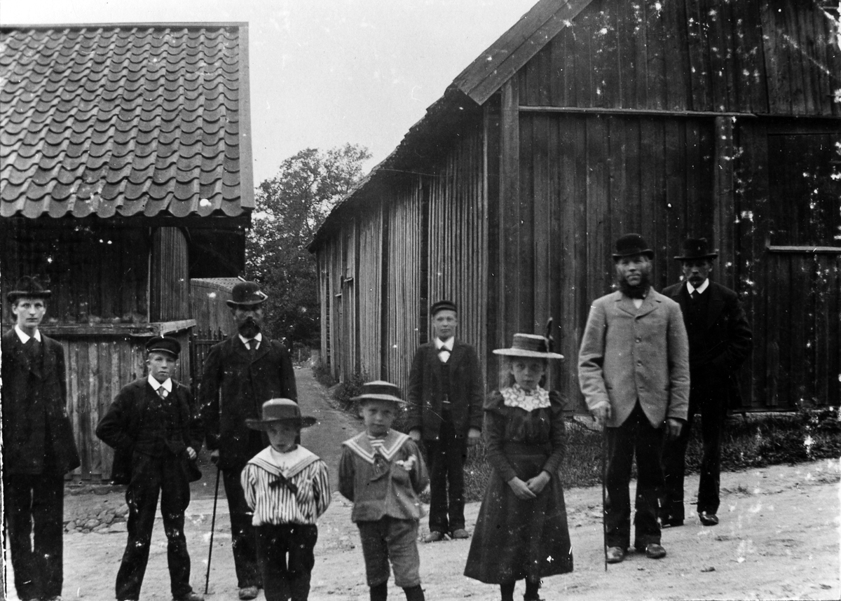 Ett antal män och barn fotograferade på en gata. Männen är garvargesäller hos garvare August Bruno.