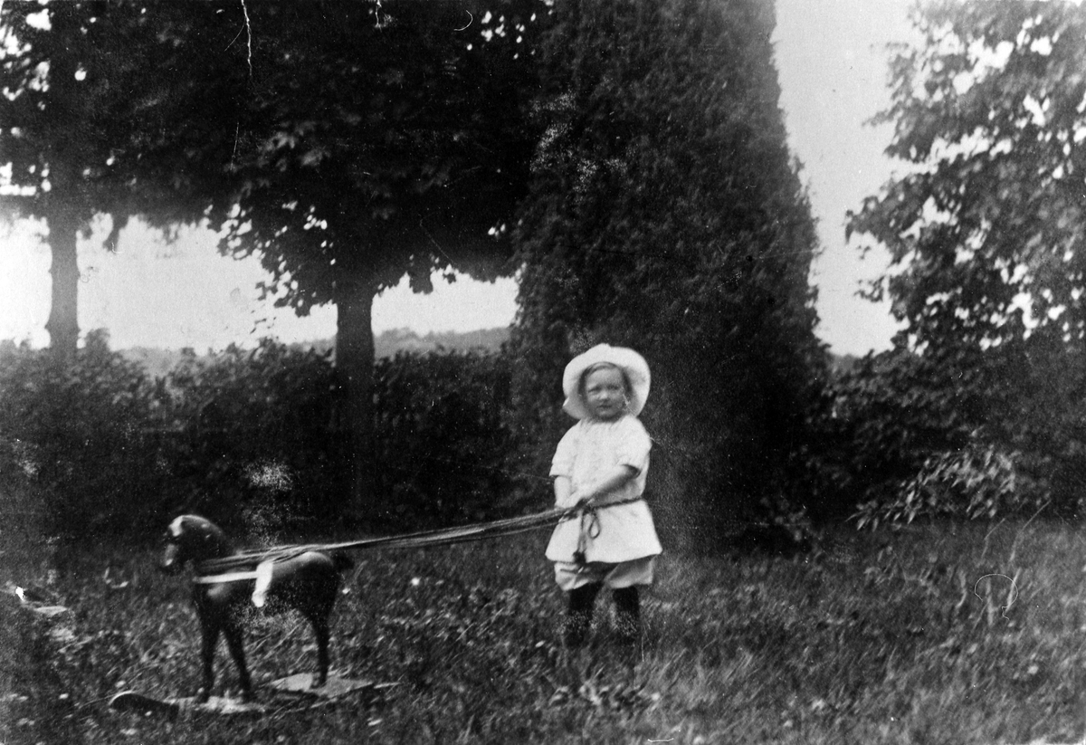 Nils Sandberg leker med en leksakshäst i en trädgård.
