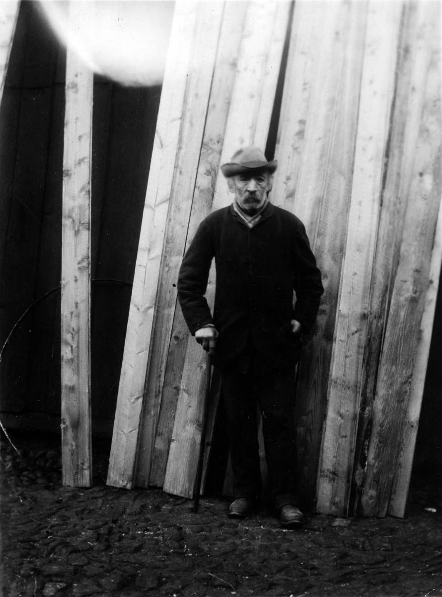 Garverigesäll Ekelöf står med händerna i fickan framför flera uppställda bräder.