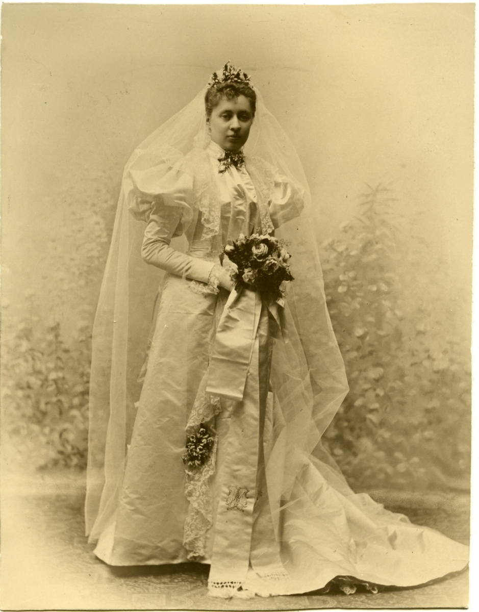 Bruden Maggie Täcklind i sin brudklänning med brudbuketten i höger hand.