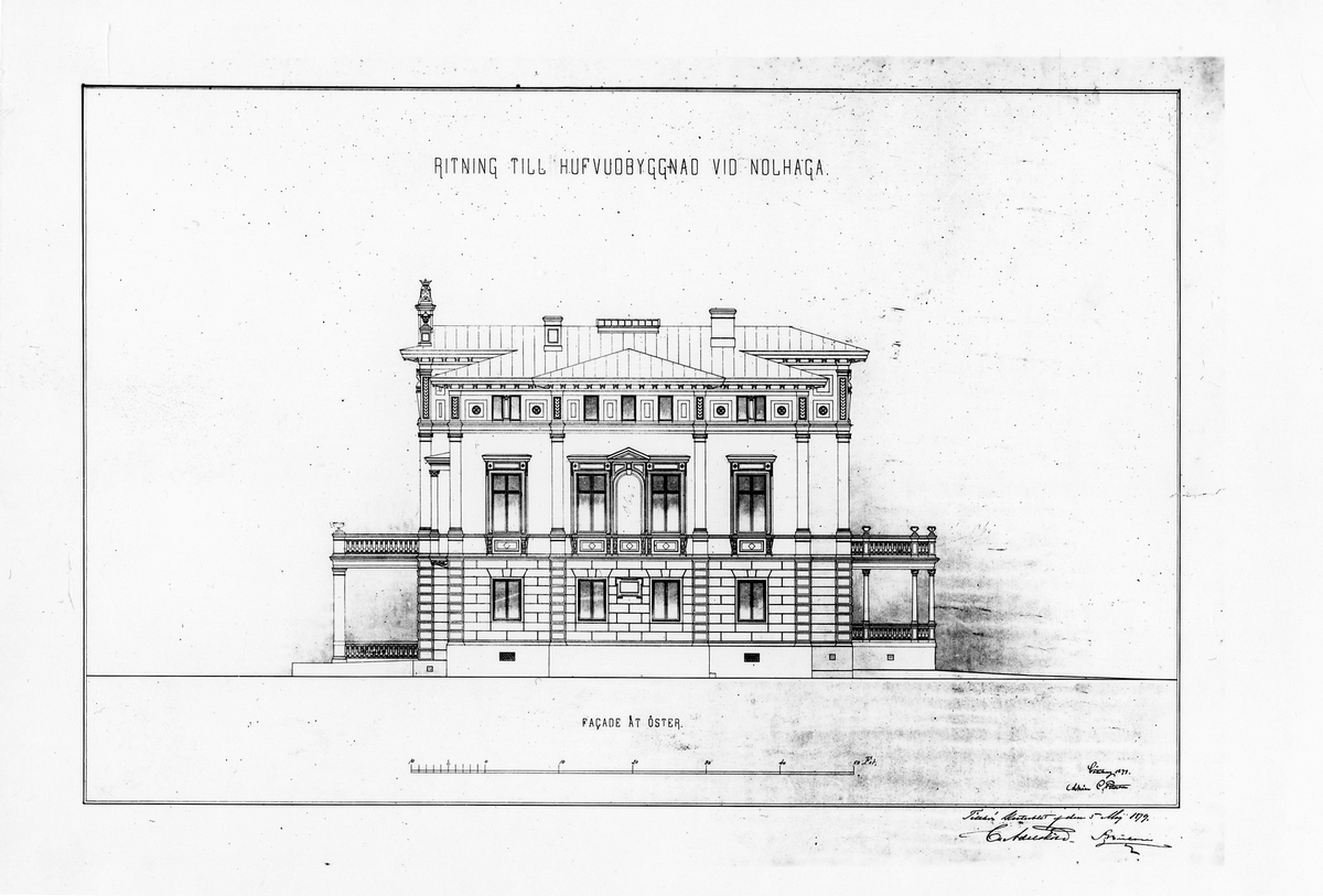 Fotografi av ritning till Nolhaga slotts huvudbyggnad, östra fasaden.