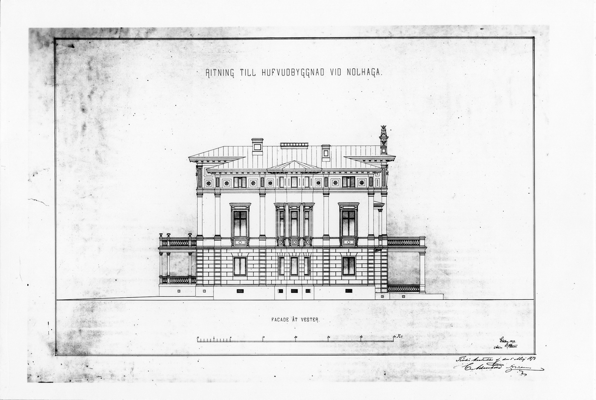 Fotografi av ritning till Nolhaga slotts huvudbyggnad, västra fasaden.