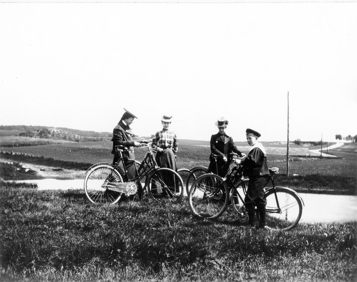 Gruppbild med tre kvinnor i kjol och hatt samt en pojke i sjömansskjorta som står på ett öppet fält med var sin cykel. I bakgrunden syns en sjö och en landsväg. Avbildade: Annie Michelsen, Maria Eriksson, Nella Hedén och Anders Hedén.