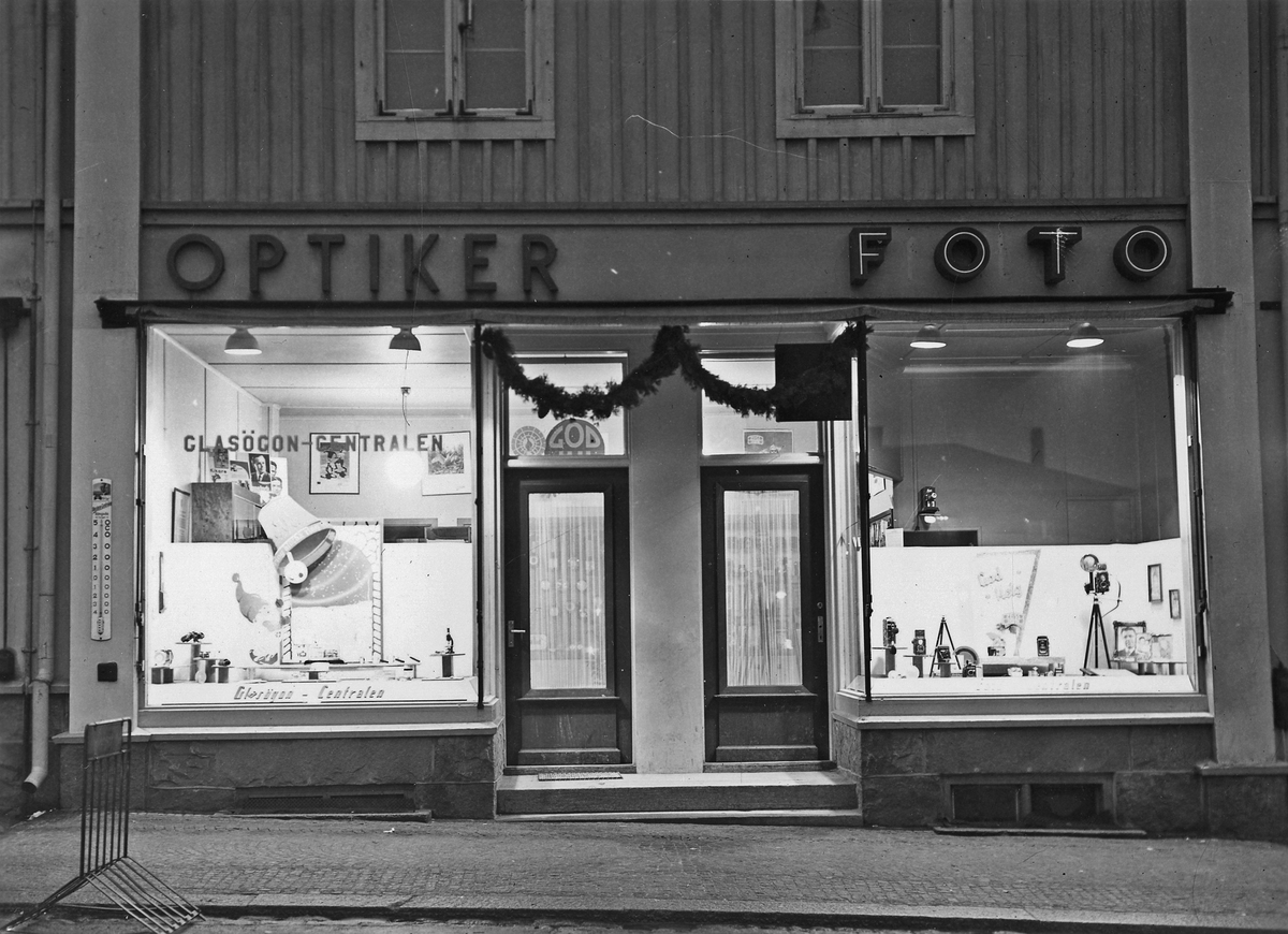 Exteriörbild med skyltfönster för optiker och foto.