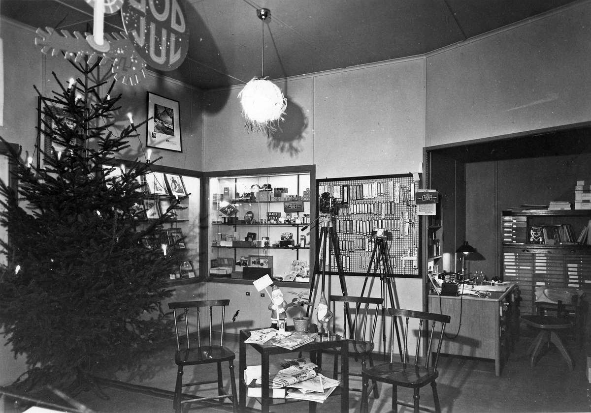 Butiksinteriör med julgran och julpynt.