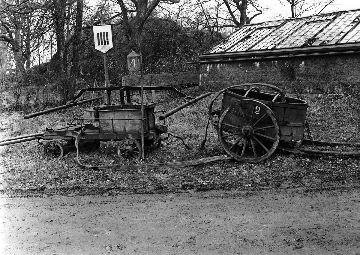 Gamla brandredskap från Alingsås. Vattenvagn och pump för att bekämpa bränder med.