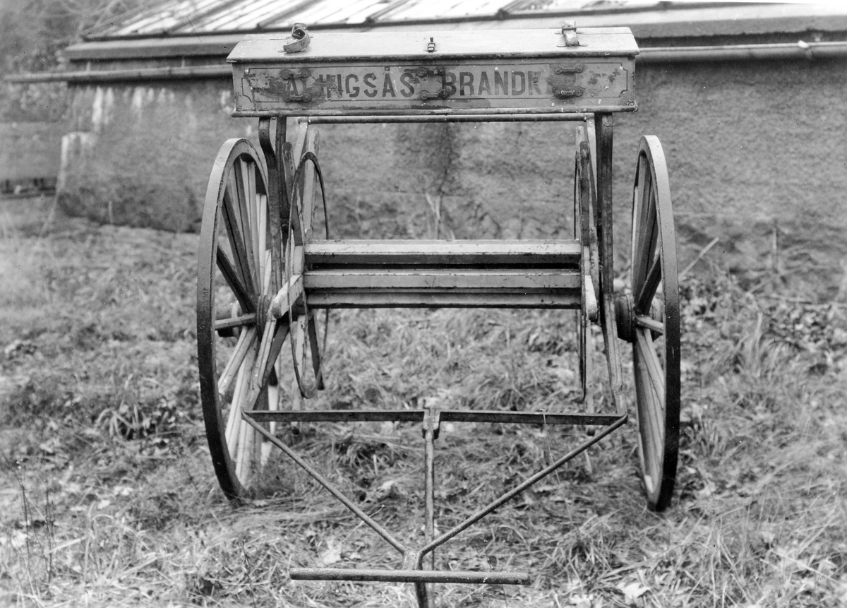 En vagn med texten "Alingsås brandkår" står uppställd på en gräsmatta framför en låg byggnad.