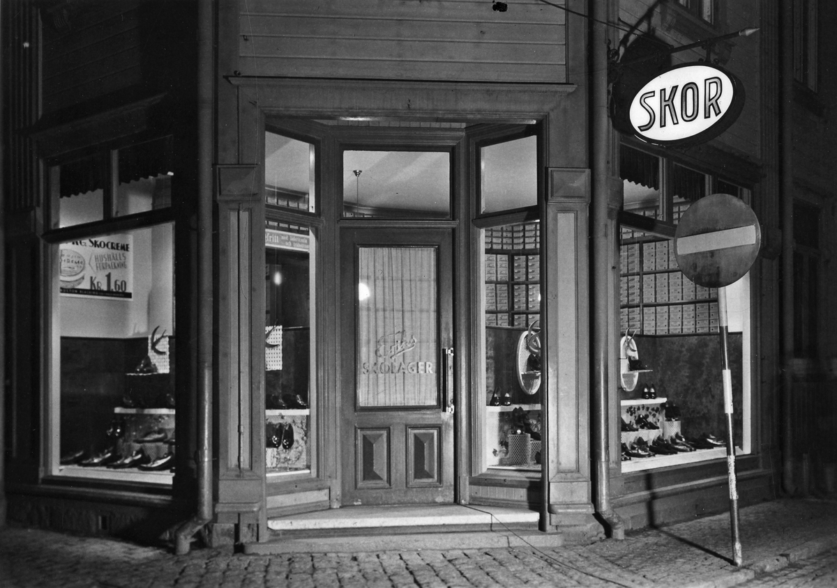 Exteriörbild med skylt på Eriks Skolager vid Kvarteret Friden i hörnet av Drottninggatan-Torggatan.