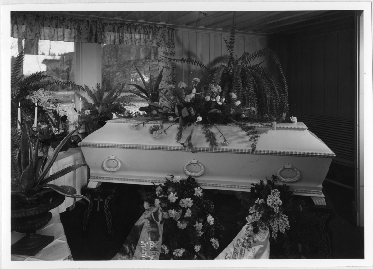 Titel: En kista täckt med begravningsblommor, en liten statyett av Jesus står i fönsterkarmen. Begravning år 1947 i Alingsås.