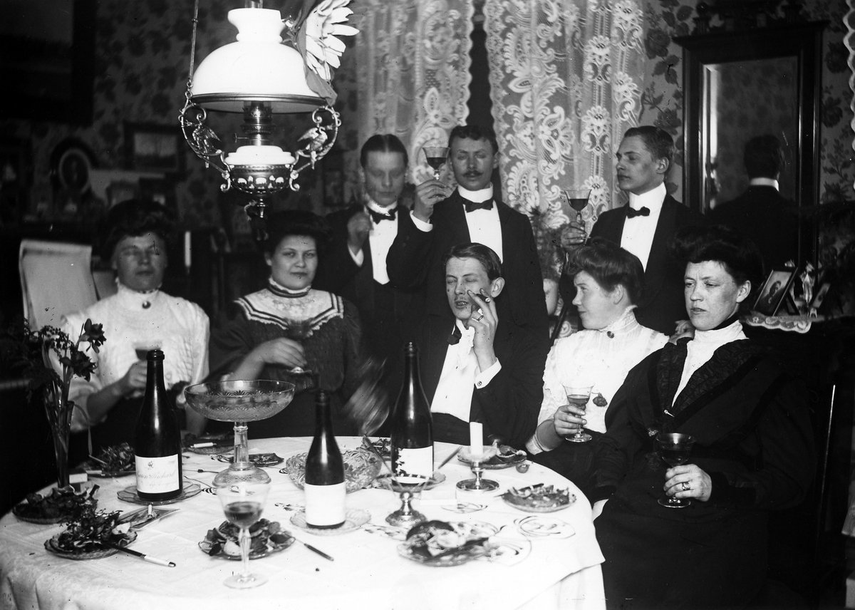 En grupp män och kvinnor samlade vid ett festdukat bord.