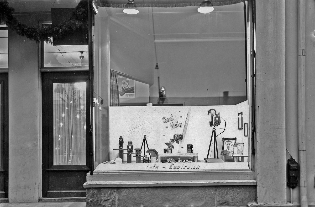I fönstret visas några kameror, stativ och fotoramar