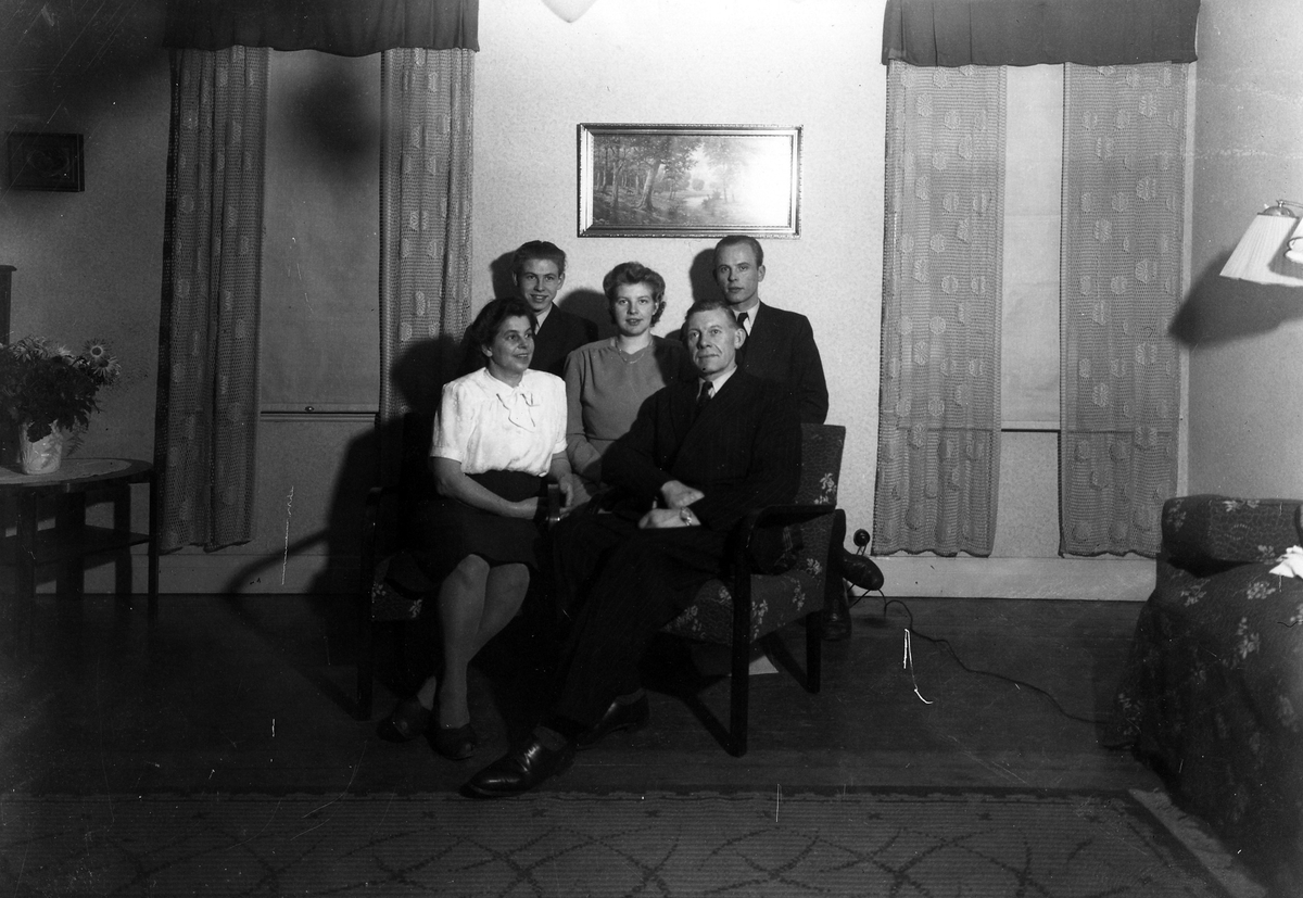 Gruppbild med tre män och två kvinnor. John Friskopp i fåföljen, bakom honom sonen Henry.