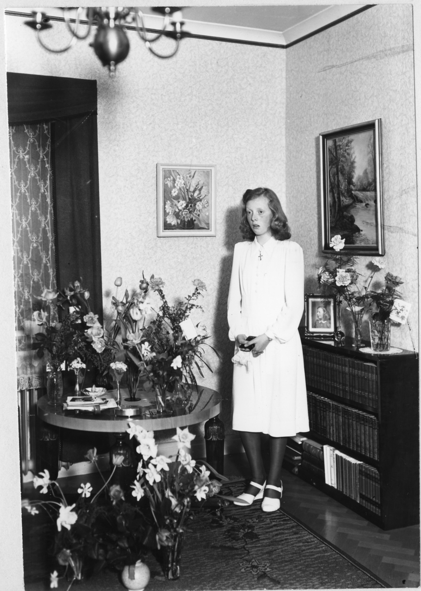 En tonårsflicka, Britt Håkansson, fotograferad med en bibel i hand framför ett bord fyllt av blommor efter sin konfirmation. Bilden tagen i hennes hem på Bergavägen.