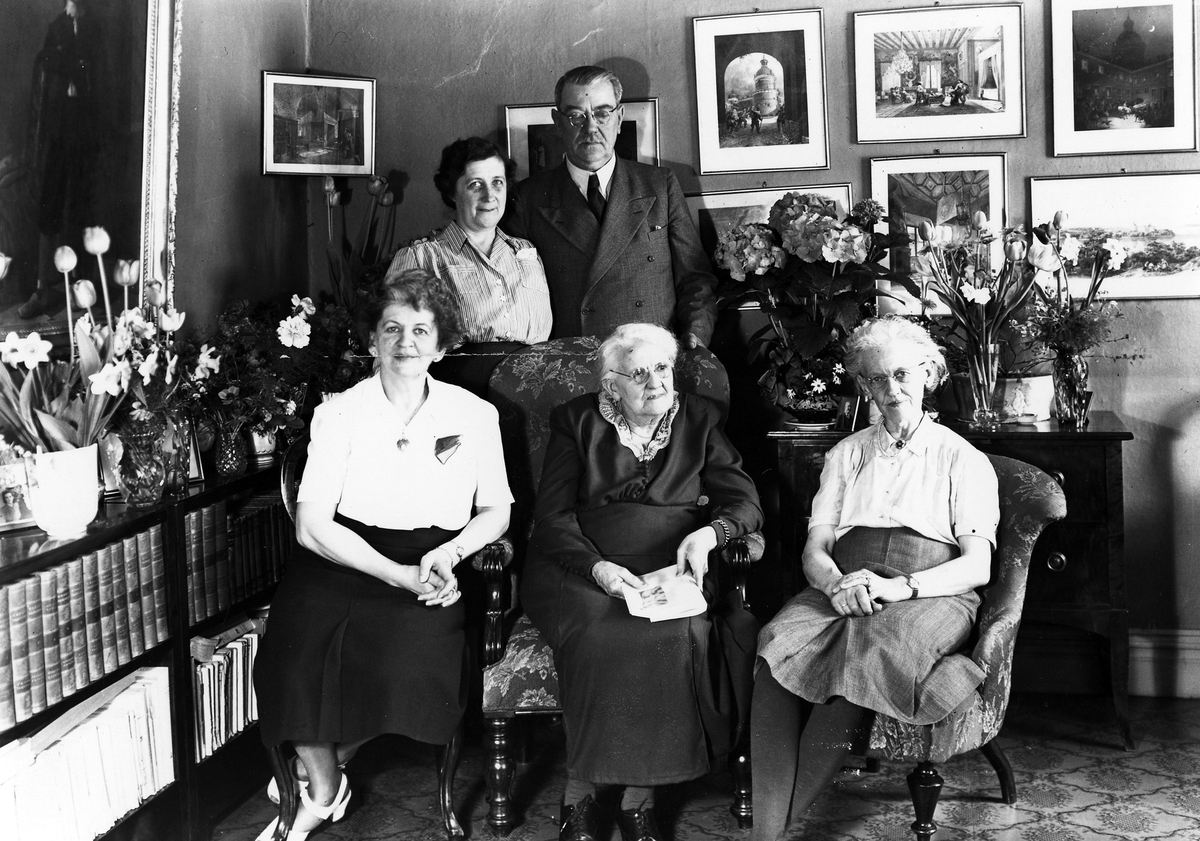 Fru Lindqvist fotograferad i sitt hem, Stora Torget 4, till vänster dottern Greta, telefonist och till höger dottern Elsa, lärarinna (gift Carlén). Övriga är okända.