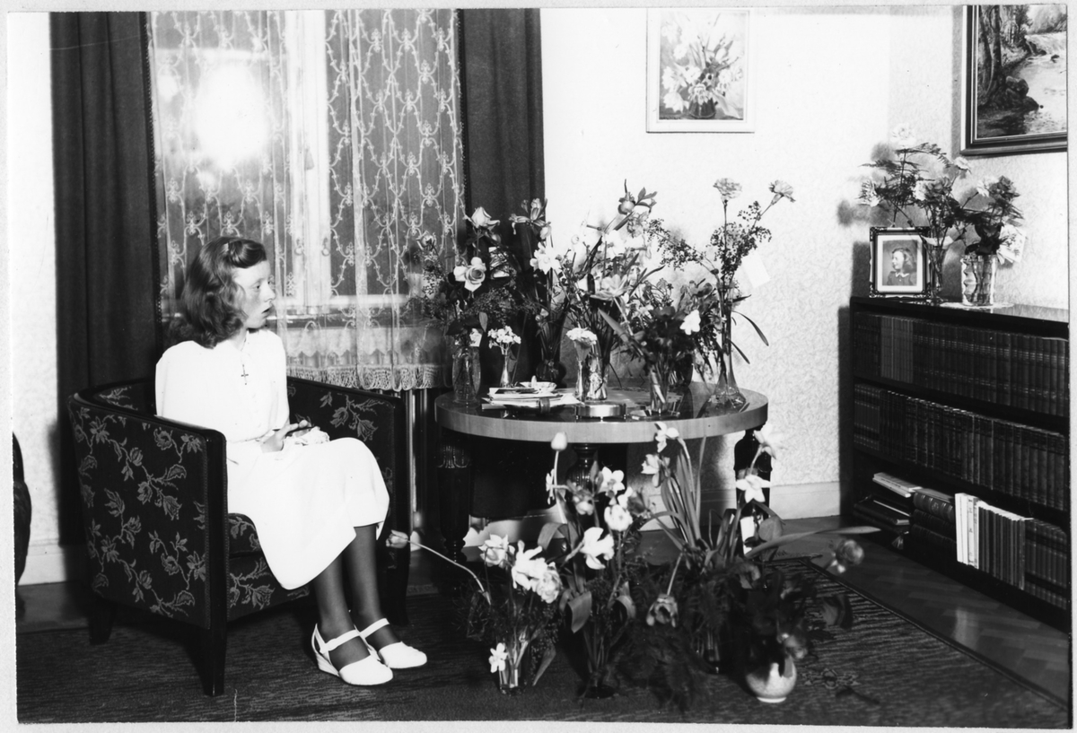 En tonårsflicka, Britt Håkansson, sitter i en fåtölj vid sidan av ett bord fyllt med blommor och så även på golvet framför. Bilden är tagen i hennes hem på Bergavägen i samband med hennes konfirmation.