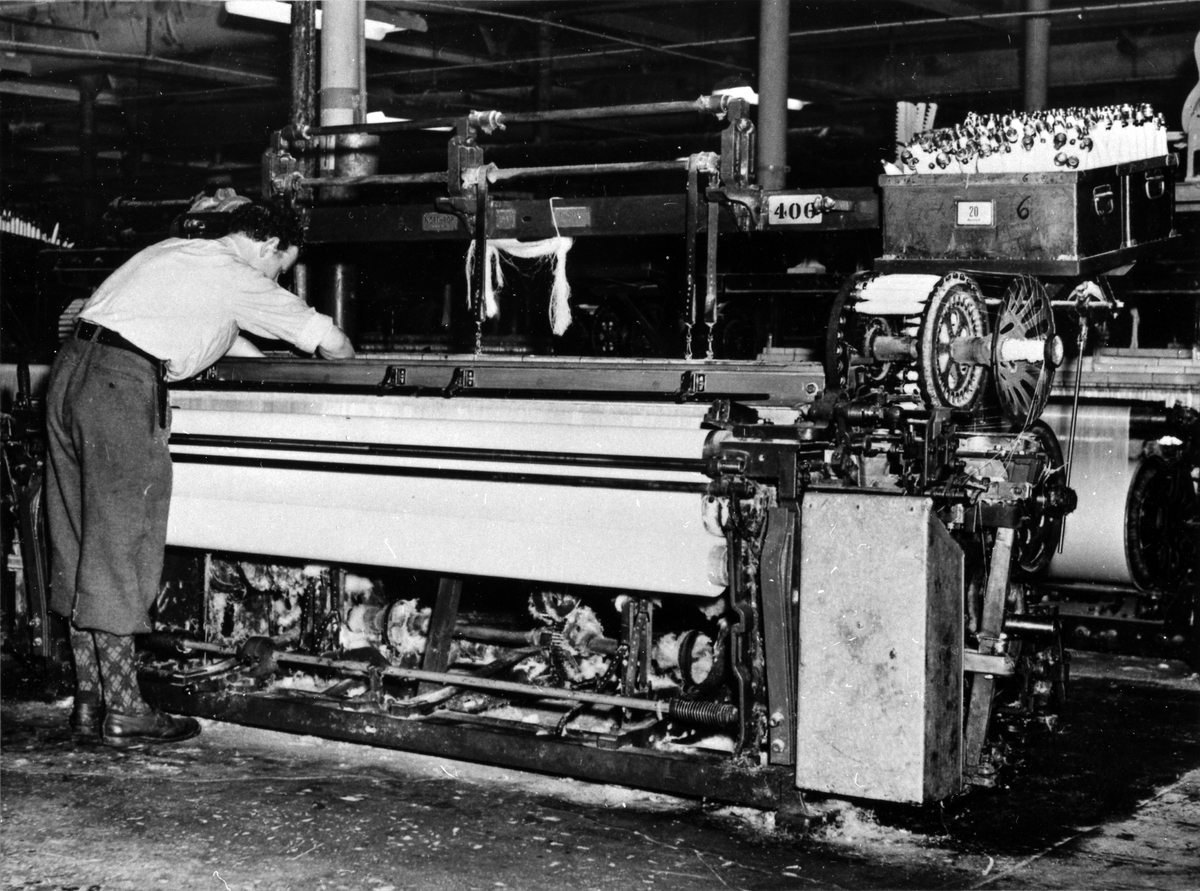 Alingsås bomullsväveri. Vävstolen Northrop automatic. Vävaren lagar en brusten tråd.