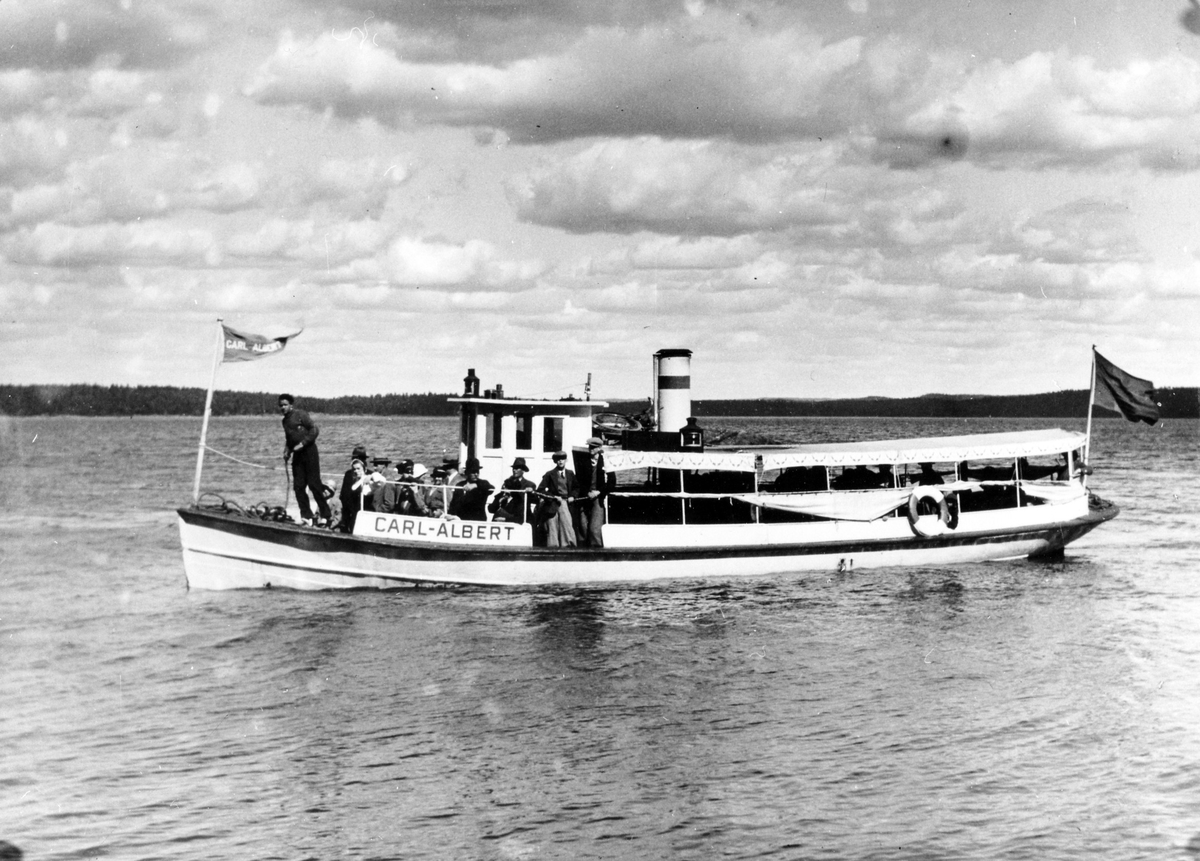 Ångslupen Carl-Albert fylld med passagerare på sjön Mjörn.