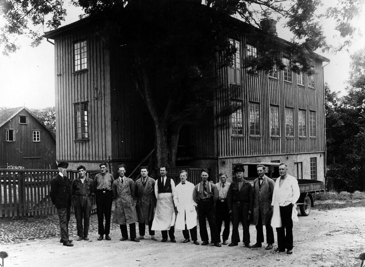 Gruppbild på personalen på Ruben Carlströms Möbelaffär framför ett trähus på 3 våningar.