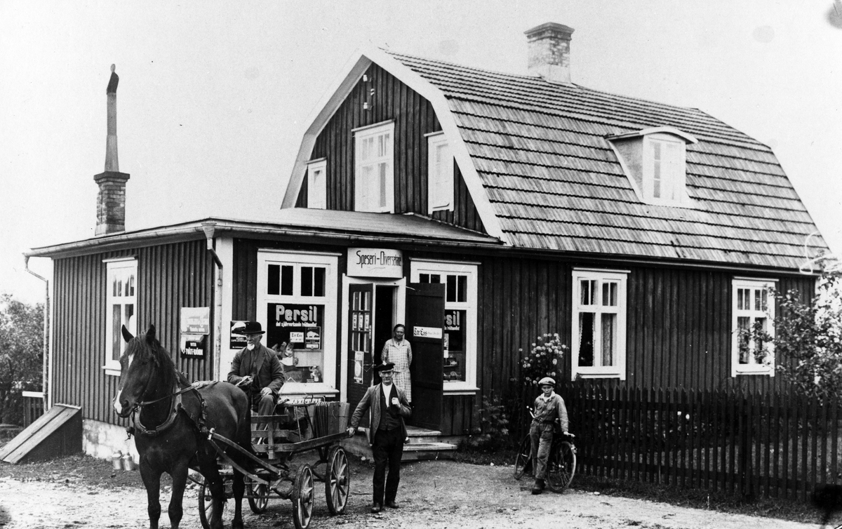 En tvåplansvilla med tillbyggd affärsdel, Gråbo Speceriaffär. Ovanför affärsingången ses en skylt med texten "Speseri-Diversehandel" och i dörröppningen står en kvinna i rutigt förkläde. Utanför affären ser vi en man med häst och vagn, en annan man som lutar sig mot hästvagnen samt en pojke som lutar sig mot en cykel.