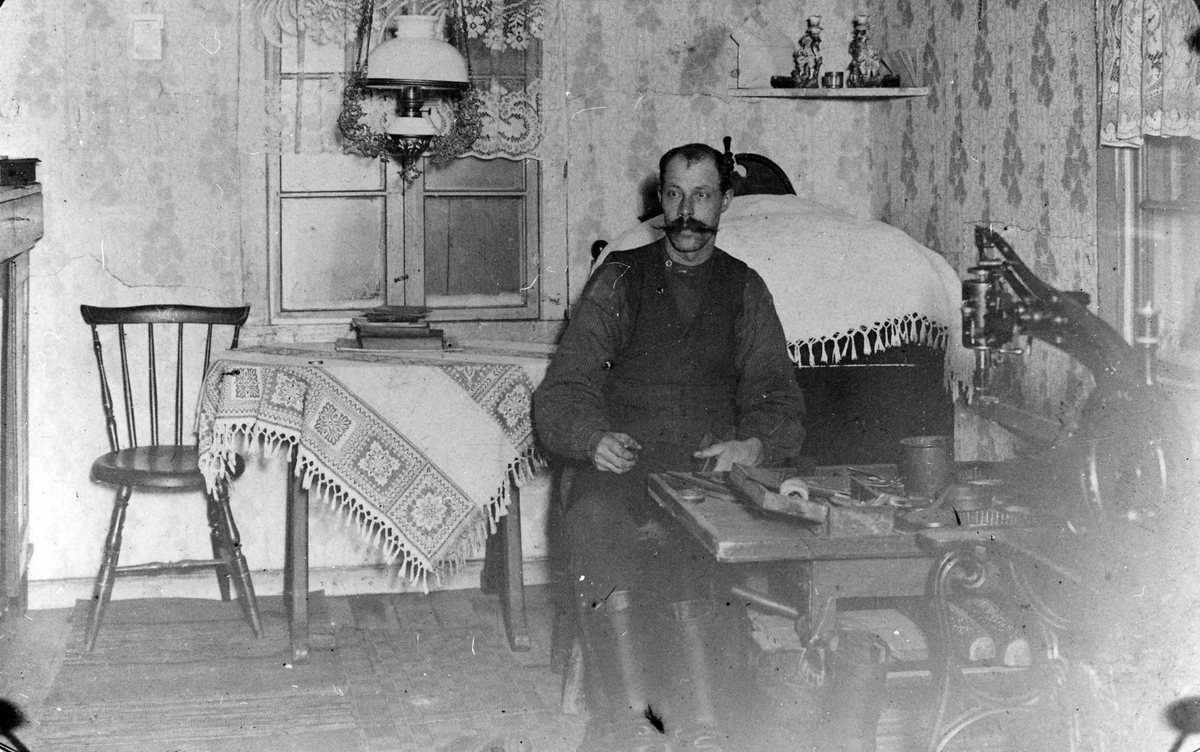 Bild på Benedictus Eriksson fotograferad i sitt hem tillika skomakeriverkstad.