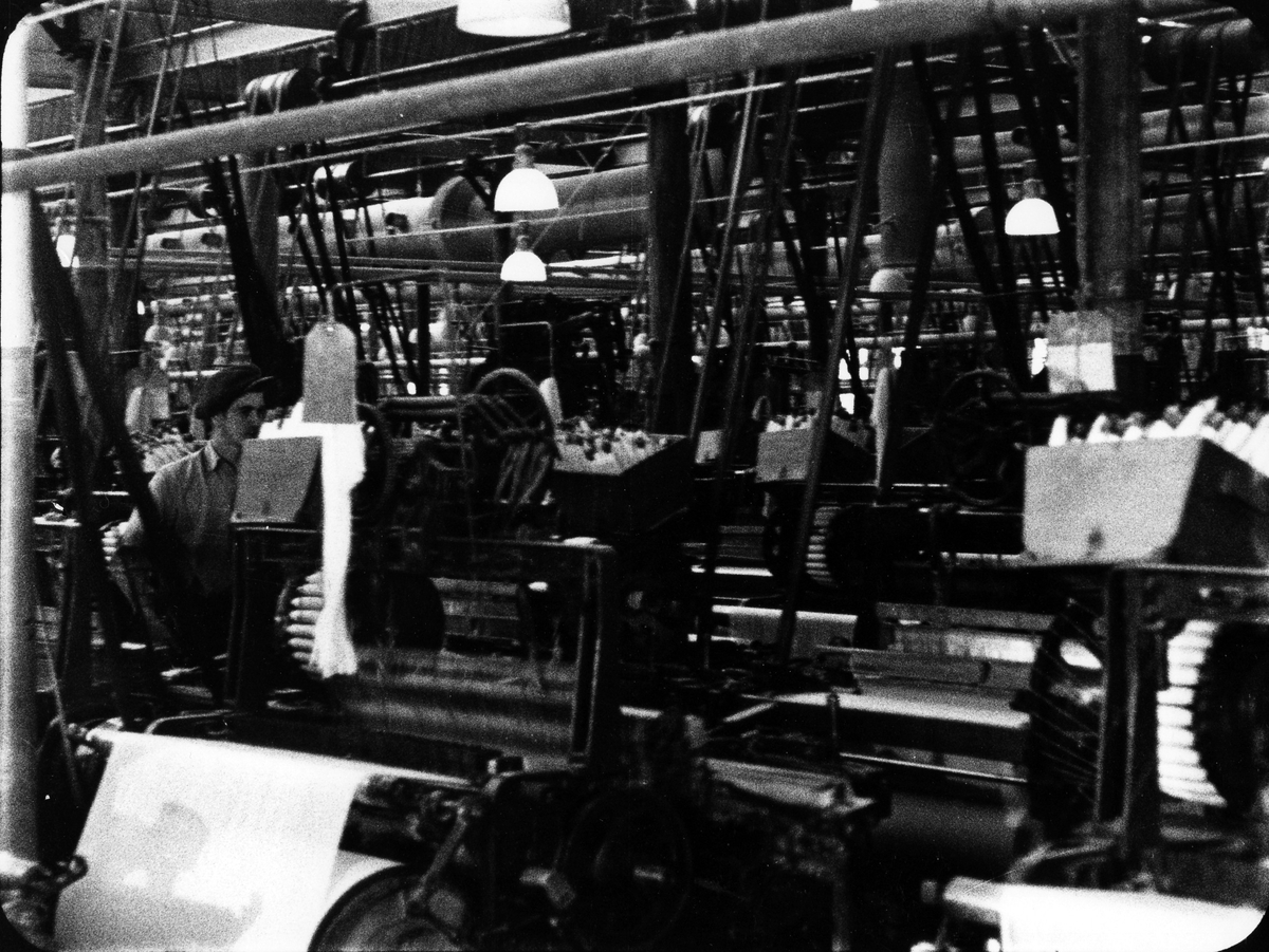 Ur filmen "Alströmers stad" från 1935. Alingsås Bomullsväveri, Nya fabriken. Vävsalen.