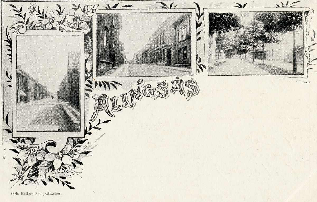 Vykort med tre fotografier omgärdade med en målad blomstergirlang. I en nedre vänstra hörnet står tryckt "Karin Möllers Fotografiatelier". Fotografierna föreställer Drottninggatan, Kungsgatan och Norra Ringgatan.