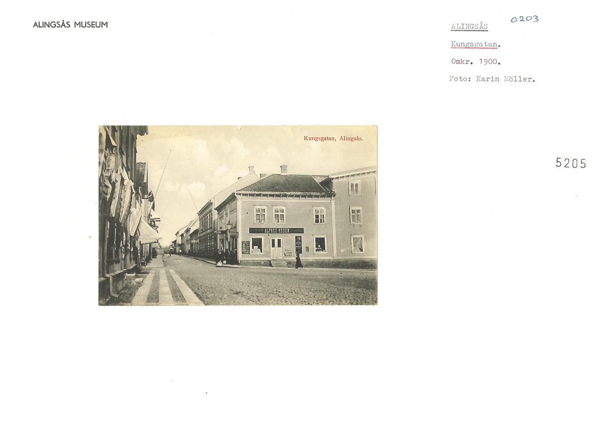 Vykort med motiv från Kungsgatan i Alingsås och Alfred Hedéns speceriaffär till höger i bild.