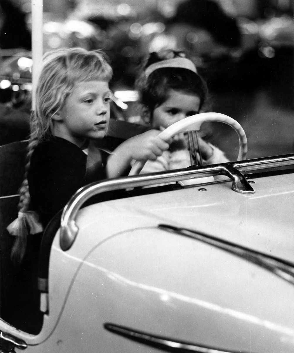 Barnens dag 1960. Två flickor sitter i en karusellvagn.