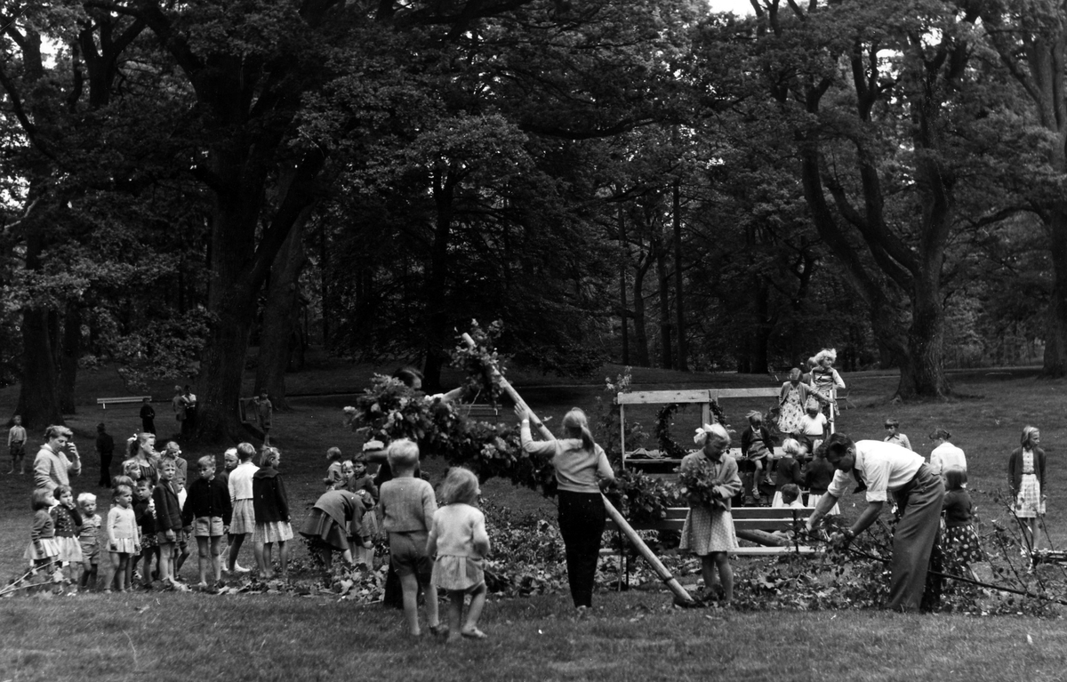 Midsommarstången kläs för midsommarfirande i Nolhaga Park 1969.