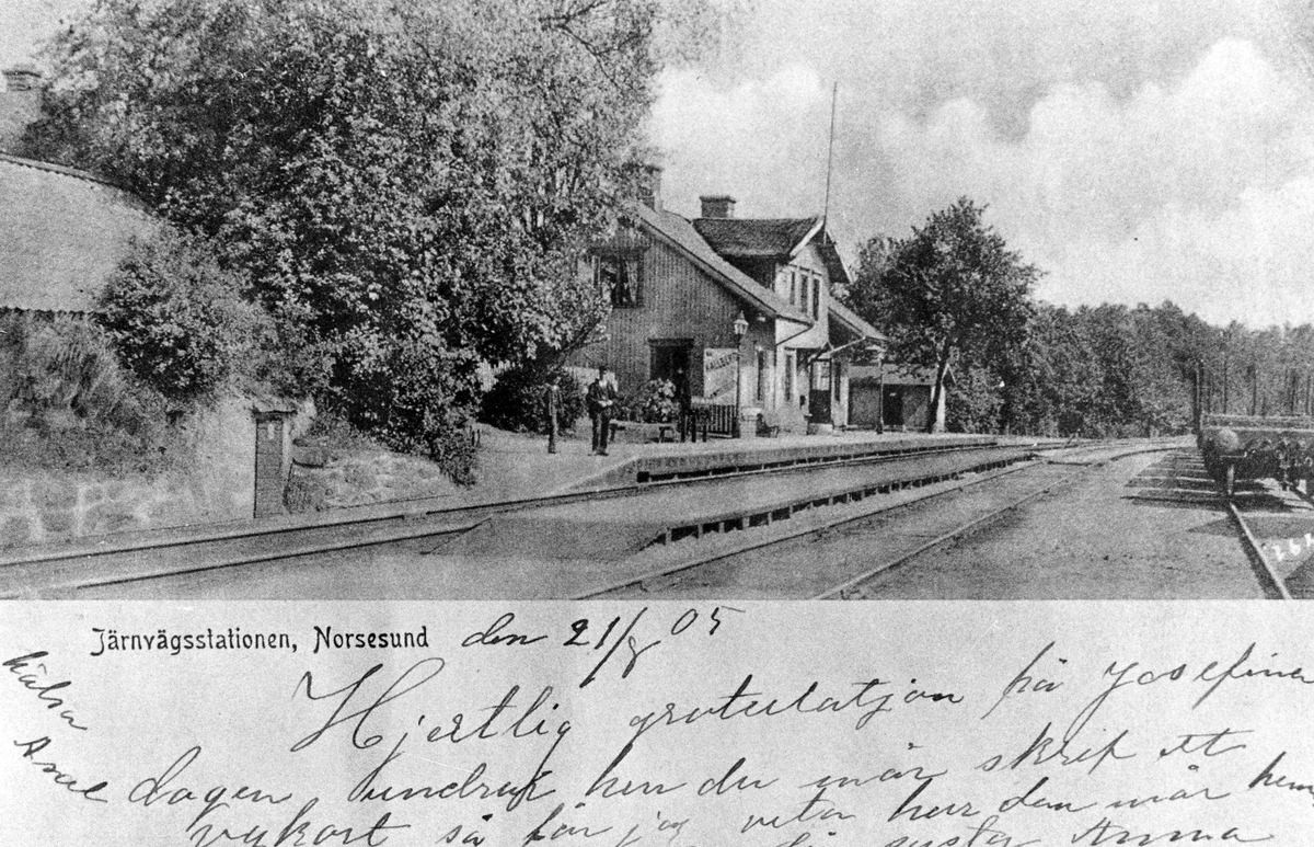Noresund järnvägsstation, till vänster järnvägsspår och stationsbyggnaden. På perrongen står några få människor. Text på bild "hälsa [svårtytt] Järnvägsstationen, Norsesund den 21/8 05 Hjärtlig gratulation på Josefina dagen, undrar hur du mår skrif ett vykort så får jag veta hur du mår hemma, din syster Anna"