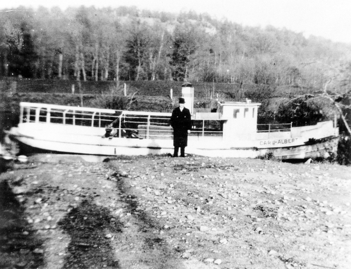Okänd man vid ångfartyget Carl-Albert på Säveån vid bron över till Nolhaga nära Sävevägen.