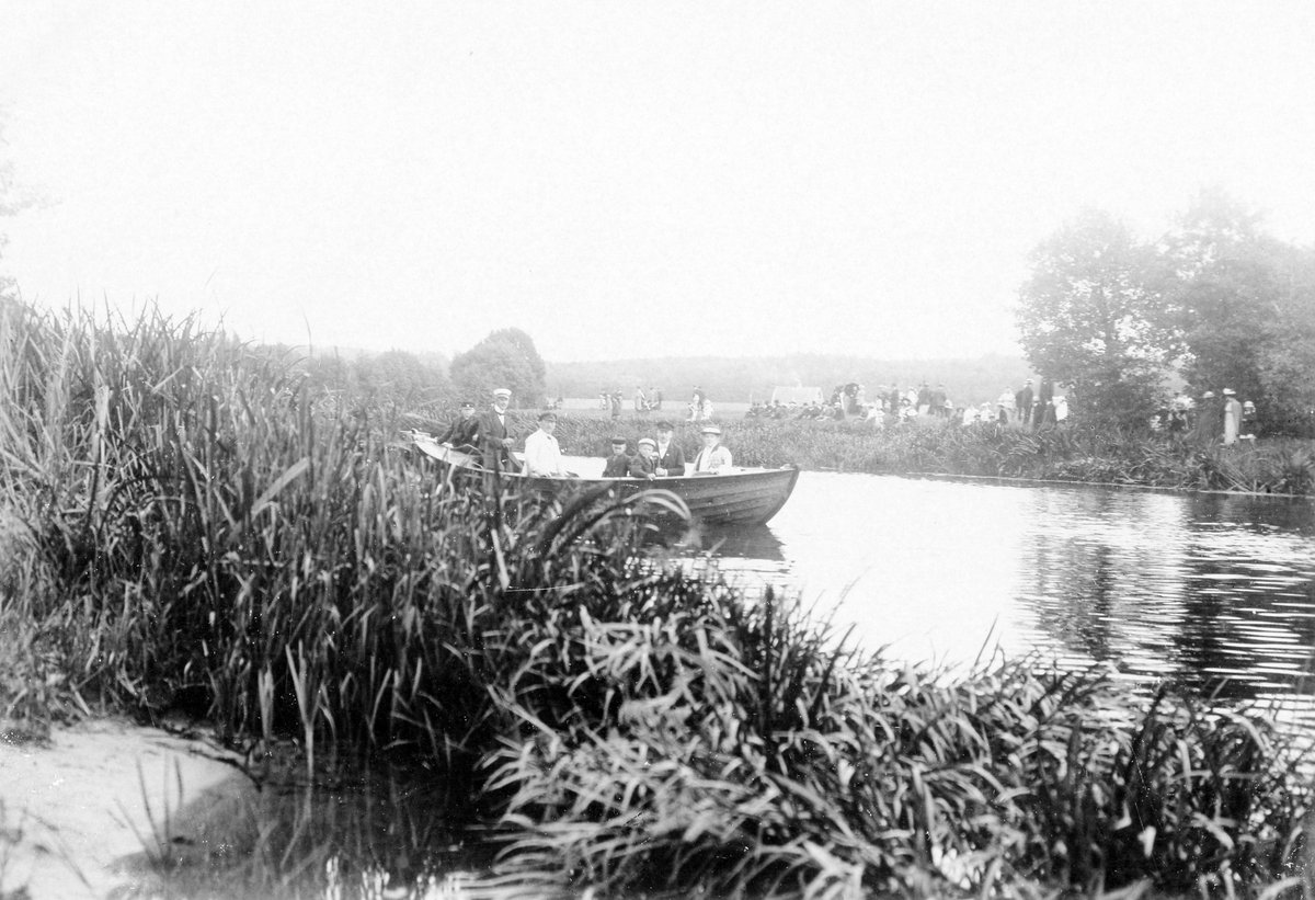 Säveån vid utloppet i Mjörn. I bakgrunden platsen för nuvarande Mjörnvallen. Sittande i båtens mitt, i vit kostym, är Johan Möller.