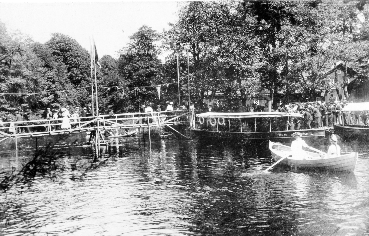 Flera sällskap av män och kvinnor på bryggan i väntan på att stiga ombord på ångbåten "Jonas Alströmer". I en eka sitter två kvinnor.
