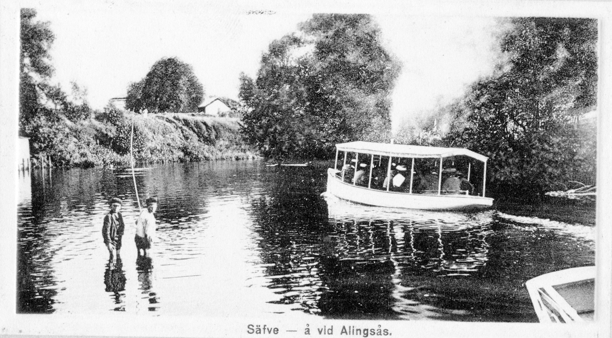 En fullsatt ångslup med överspänt tak rör sig framåt på Säveån. Båten ägdes av godsägare Axel Dickson, Vikaryd. Till vänster på bilden står två pojkar med vatten upp till knäna och fiskar. Text på bilden "Säfve - å vid Alingsås".