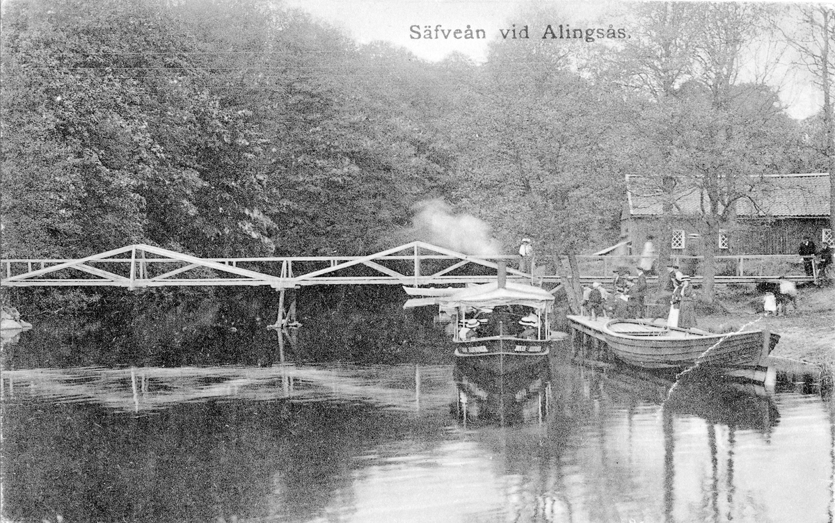 Vid bron som sträcker sig över Säveån ses en fullsatt ångslup "Jonas Alströmer" en större eka samt en smärre folksamling vid byggan. Text på kortet "Säfveån vid Alingsås"